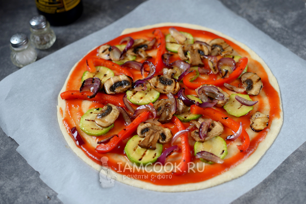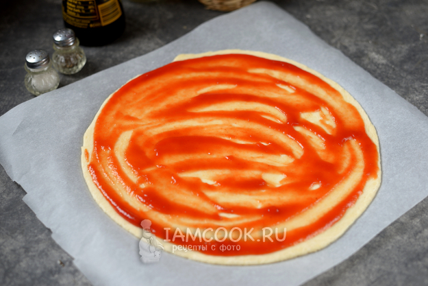 На бумаге для выпечки раскатайте тоненько половину теста, при необходимости присыпайте мукой. Смажьте заготовку двумя ложками томатного соуса.