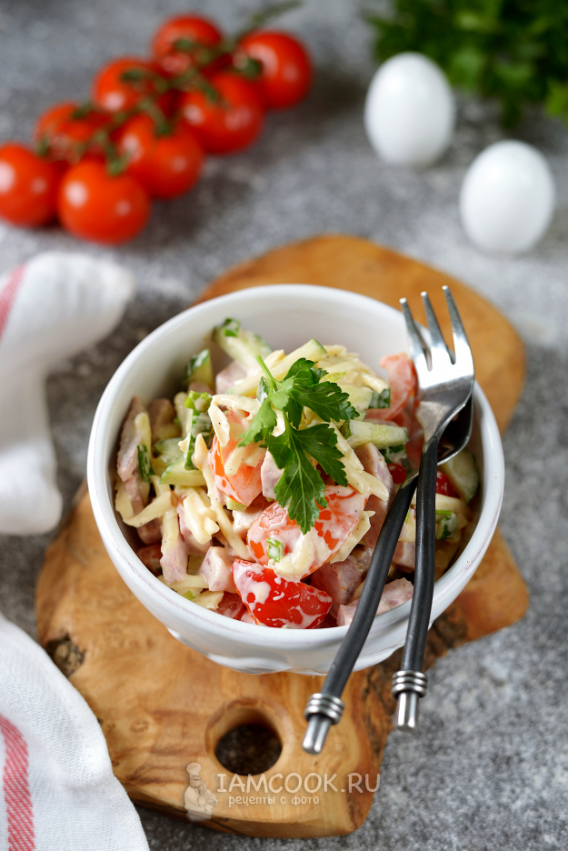 Салат с бужениной и помидорами готов. Разложите его по порциям и подавайте к столу в качестве холодной закуски.