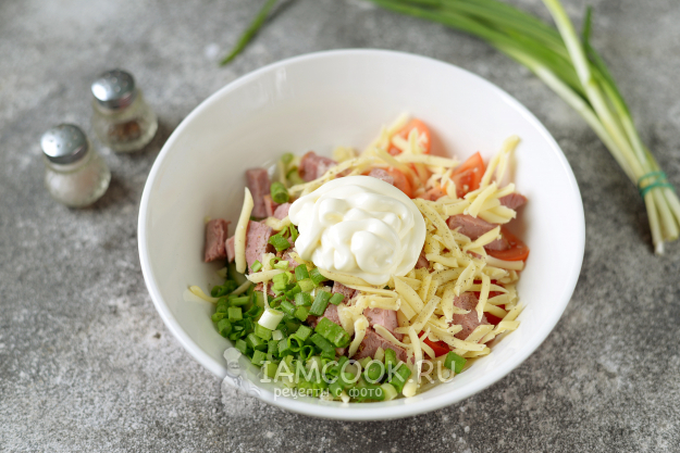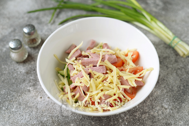 Буженину нарежьте брусочком или мелким кубиком, добавьте натертый на крупной терке твердый сыр.