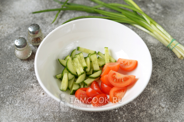 Огурец нарежьте тонкими ломтиками, помидоры - на четвертинки или дольки. Вкуснее всего использовать в этом салате коктейльные помидоры или черри, они сладкие и ароматные.