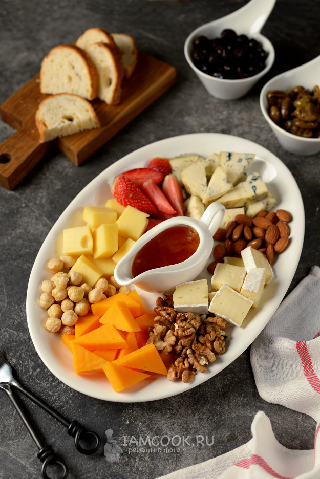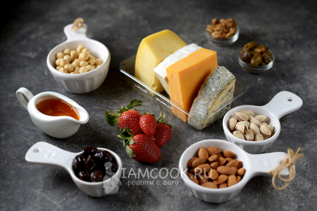 Подготовьте все необходимые продукты для оформления сырной тарелки. Ягоды или фрукты помойте, обсушите насухо бумажными полотенцами. Если будете использовать яблоки или груши, тогда дольки лучше сбрызнуть лимонным соком, чтобы не темнели. В сезон очень хорошо будет положить к сырам пару видов винограда.