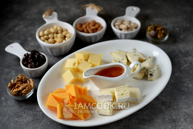 В центр большого блюда поставьте жидкий мед в небольшом сотейнике. Сыры нарежьте любой удобной формы - кубиком, треугольником, прямоугольником и т.п., выложите на блюдо горками, оставьте между ними пустые места.