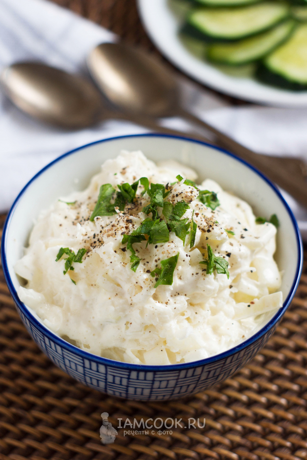 Заправьте салат майонезом и сметаной, посолите, добавьте черный молотый перец. Перемешайте и подавайте к столу - салат из редьки с майонезом готов.