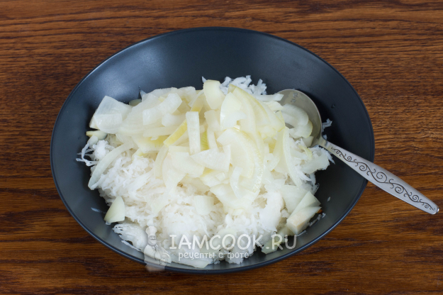 Репчатый лук почистите, нарежьте четверть-кольцами или кубиками. Я также залила измельченный лук кипятком, как и редьку, чтобы в салате не было резкости. Воду слейте и добавьте лук к редьке.