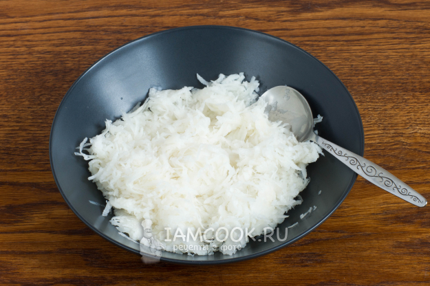 Затем воду слейте, откинув редьку на сито. Отожмите редьку при помощи столовой ложки и положите в большую миску.