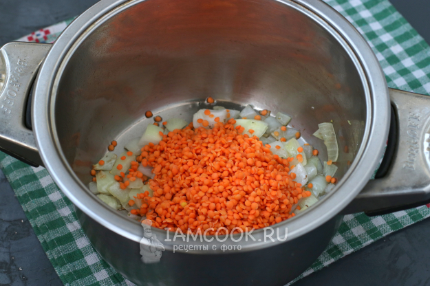 В кастрюле, в которой будем готовить суп, разогреть ложку масла, добавить лук и слегка обжарить, добавить промытую чечевицу и перемешать.