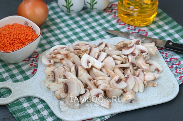Подготовьте ингредиенты для супа-пюре из чечевицы с шампиньонами.