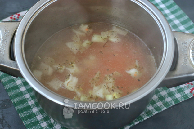 Всыпать орегано или другие травы. Далее влить воду или бульон. Варить 10 минут.