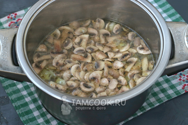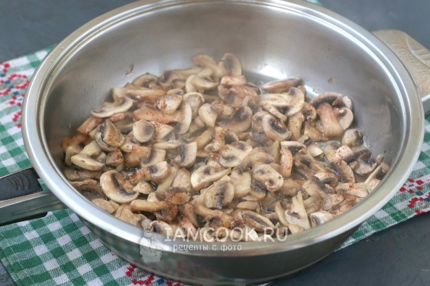В сковороде разогреть 2 столовых ложки масла, добавить нарезанные шампиньоны, и готовить до лёгкой мягкости грибов, зажаривать грибы не нужно. В конце грибы посолить.