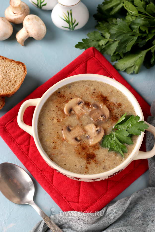 Суп-пюре из чечевицы с шампиньонами готов. Разлить его по тарелкам и подать к столу.