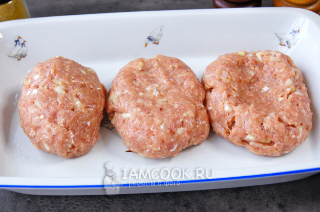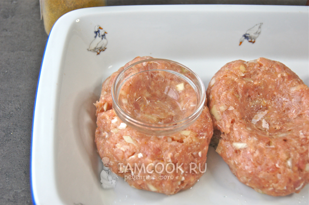 При помощи небольшой пиалки сделайте углубления в мясных заготовках.