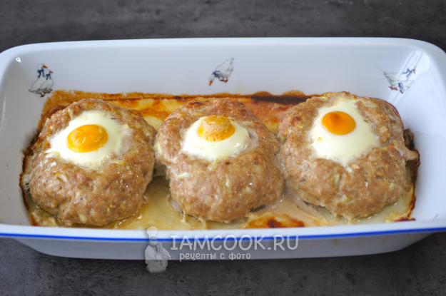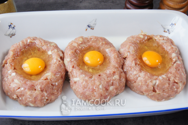 Разделите фарш на 3 равные части, сформируйте шницели и выложите в смазанную форму, они получатся довольно-таки крупными. Если вы хотите сделать маленькие шницели, понадобятся перепелиные яйца.