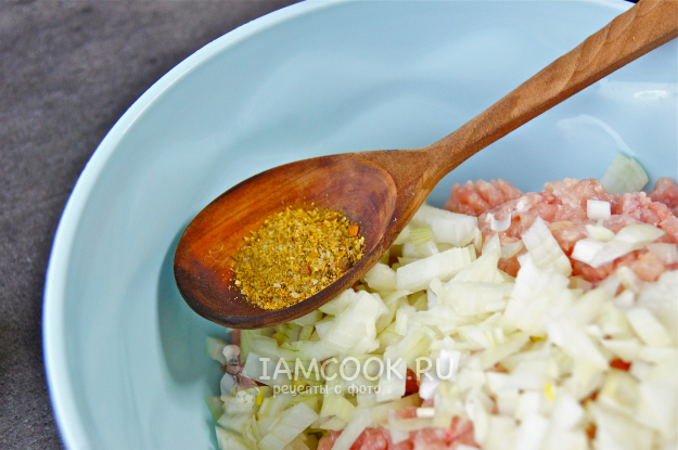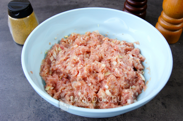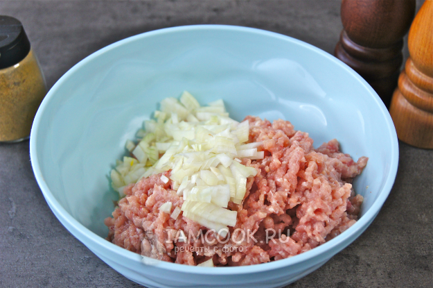 Лук очистите, мелко нарежьте и отправьте в фарш.