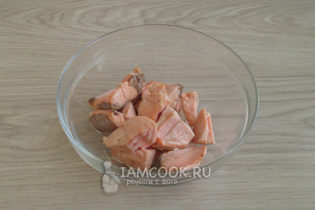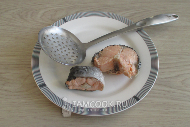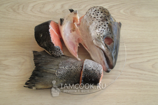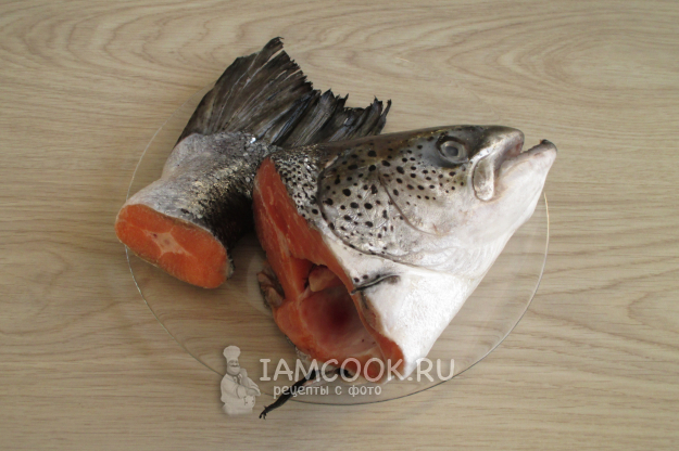 Подготовьте ингредиенты: голову, хвост и мякоть лосося. Обычно они замороженные, и лучше когда шоковой заморозки. Размораживайте постепенно: из морозилки переместите рыбу в холодильник на несколько часов, а затем продолжайте при комнатной температуре.