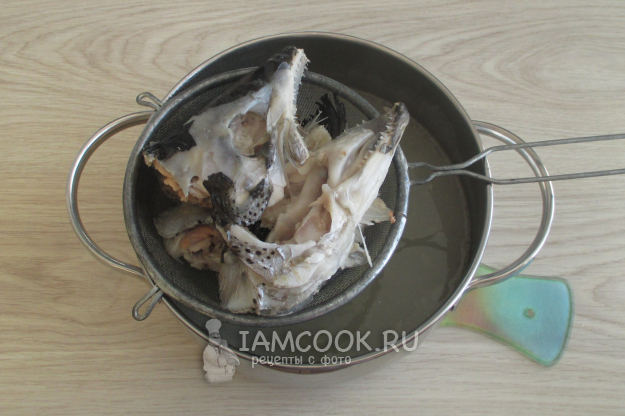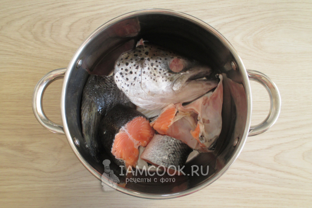 Поместите голову, хвост и куски с мякотью в кастрюлю, залейте водой и доведите до кипения. После закипания снимите пену.