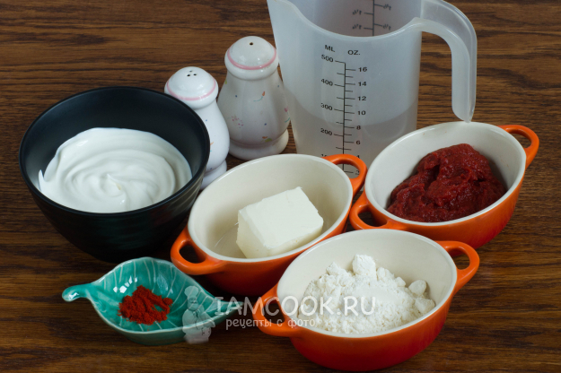 Подготовьте необходимые продукты для приготовления соуса из сметаны и томатной пасты.