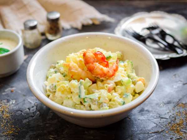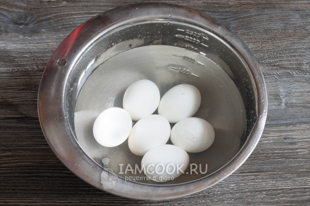 Отвариваем вкрутую яйца и охлаждаем их. Если креветки не варёные, то их следует отварить в слегка подсоленном кипятке 2-3 минуты.