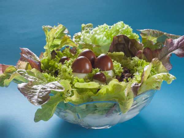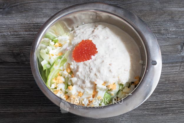 Смешиваем в куполообразной миске салат из айсберга, яиц, сметанно-креветочного соуса и двух столовых ложек красной икры. Солим по вкусу.