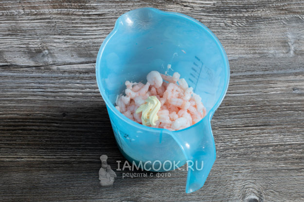 Блендером смешиваем соус из сметаны, креветок и ложечки майонеза.