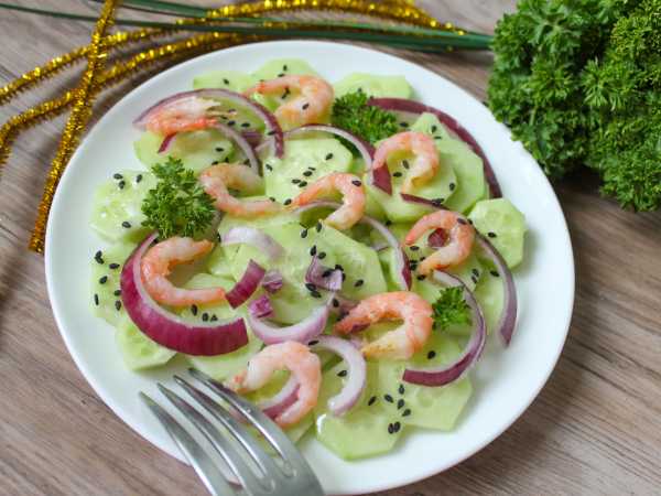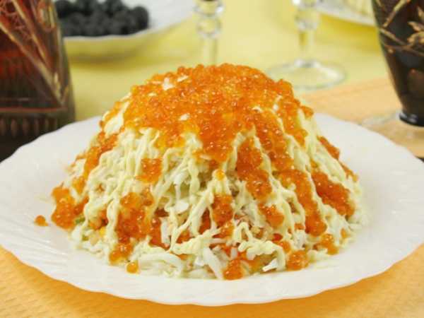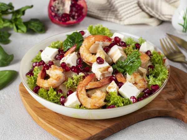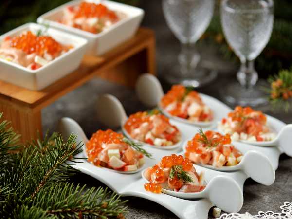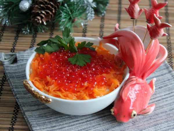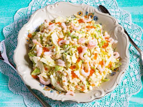 Декорируем салат креветками и красной икрой.