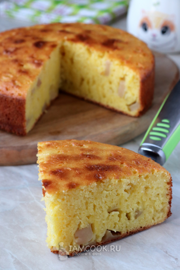 Внутри пирог получается пористым и воздушным, а яблоки его делают безумно ароматным и придают сладкой текстуре лёгкую кислинку.