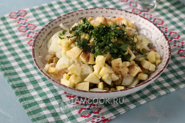 Салат немного посолить и поперчить, добавить измельчённую петрушку.
