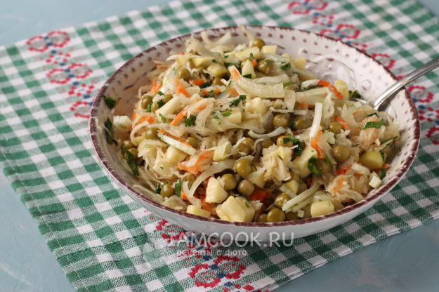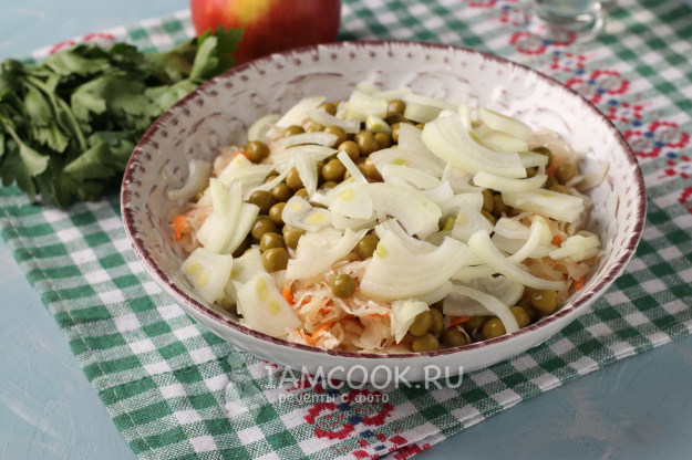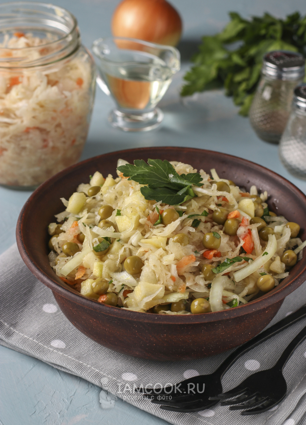 Подать вкусный салат из квашеной капусты с консервированным горошком и яблоком к столу.