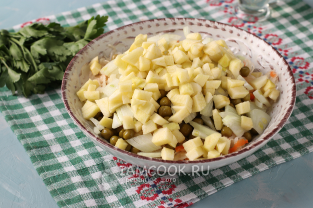 Соломкой нарезать лук и добавить его к капусте с горошком. Лук можно взять красный, он красиво смотрится в салате и менее ядрёный, чем репчатый.