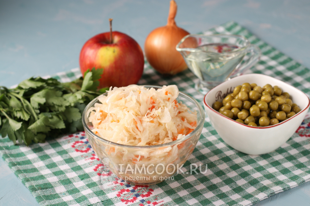 Для приготовления салата из квашеной капусты с горошком и яблоком подготовить из списка необходимые ингредиенты.