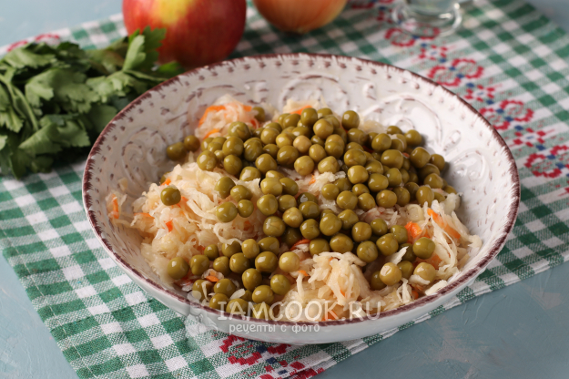 Квашеную капусту поместить в тарелку, добавить горошек без жидкости.