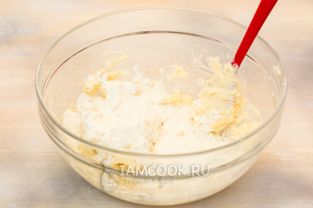 Добавьте муку (не добавляйте всю сразу, возможно, ее понадобится меньше или больше указанного количества) и разрыхлитель.