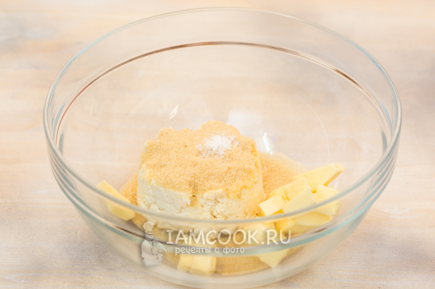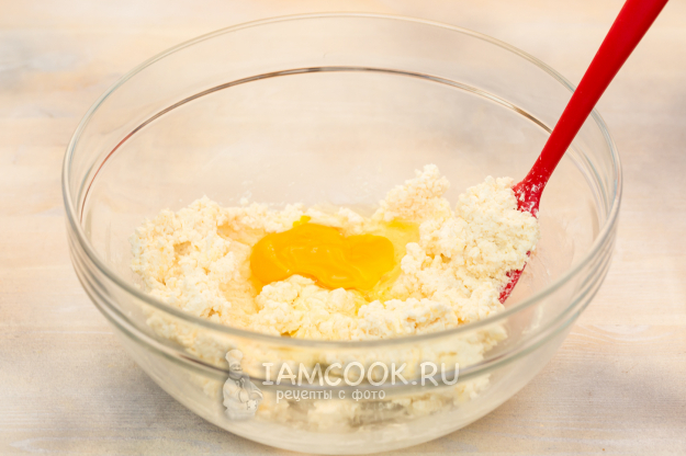 Смешайте творог, масло, сахар, ванилин, соль.