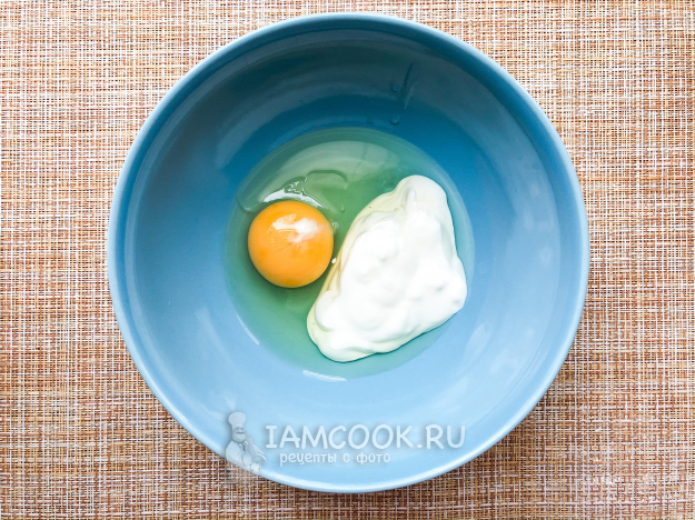 Масло растопите в микроволновке. Соедините его с яйцом и йогуртом. Тщательно перемешайте венчиком.