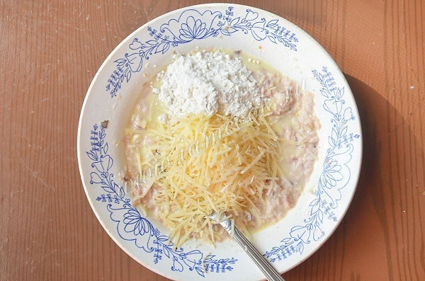 Затем добавить сыр, натертый на мелкой терке, муку, соль, снова перемешать.