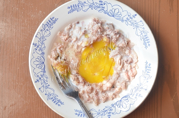 Приготовить омлет. Для этого из банки с тунцом слить жидкость, тунец размять вилкой. Добавить яйцо и сливки, перемешать.