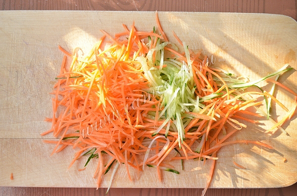 Морковь и огурец тонко нарезать или натереть на терке для корейской моркови.