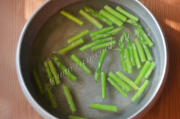 Спаржу нарезать, отварить в кипящей воде в течение 1 минуты, воду слить.