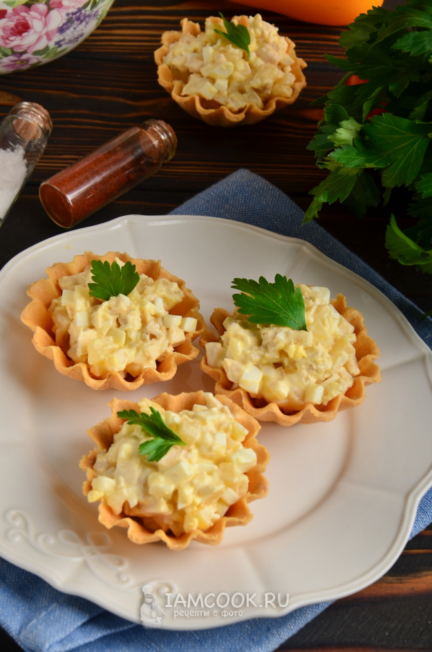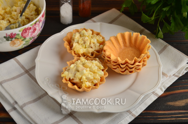 На стол тарталетки с курицей и ананасом нужно подавать сразу после приготовления, когда формочка еще остается хрустящей.