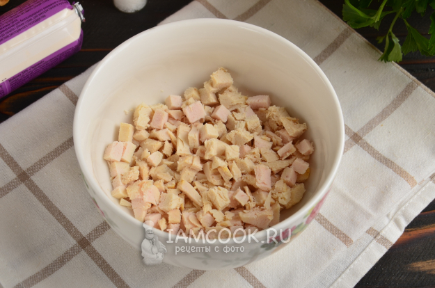 Остывшее куриное мясо нарежьте мелкими кубиками или разберите на волокна, положите в пиалу.
