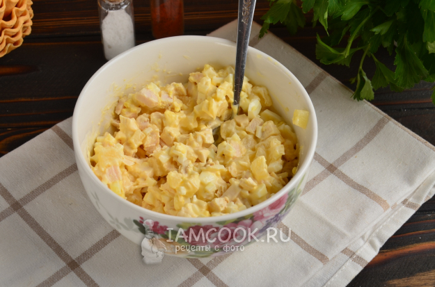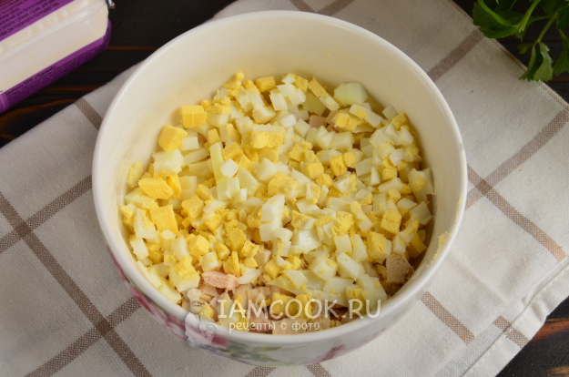 Сваренные вкрутую куриные яйца почистите и нарежьте мелкими кубиками. Если яйца крупные, можно использовать одно.