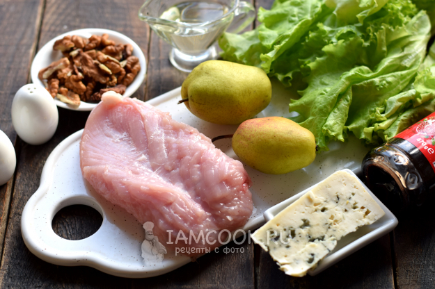 Подготовьте продукты для салата с индейкой, грушей и сыром Дор Блю.