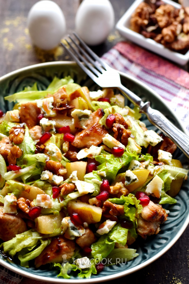 Салат полейте гранатовым соусом, при желании присыпьте зернами граната, подайте на стол.