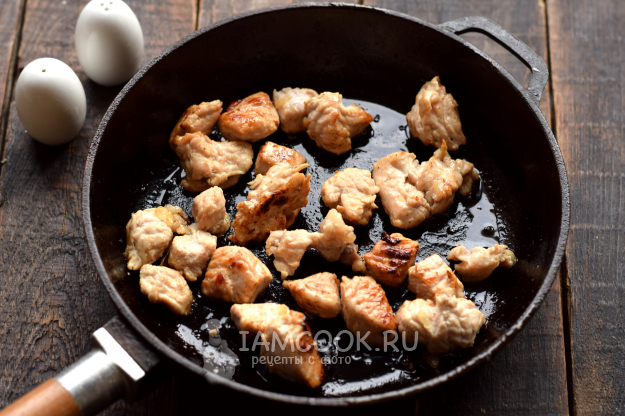 Филе индейки нарежьте крупными кусками, обжарьте в масле 10 минут - до готовности, посолите. Чтобы мясо получилось сочным, кладите кусочки на хорошо разогретую поверхность, жарьте его на сильном огне.