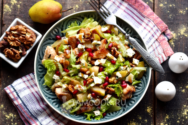 Смесь выложите на плоскую тарелку для подачи. Голубой сыр поломайте на куски, присыпьте им салат.