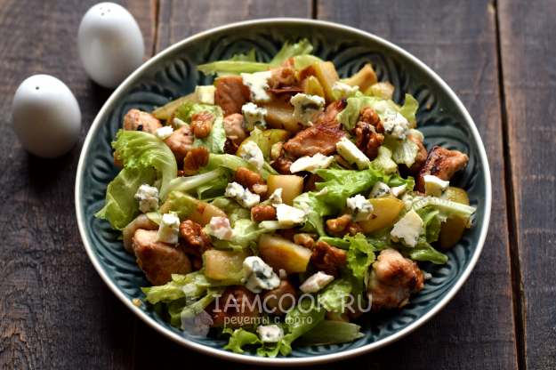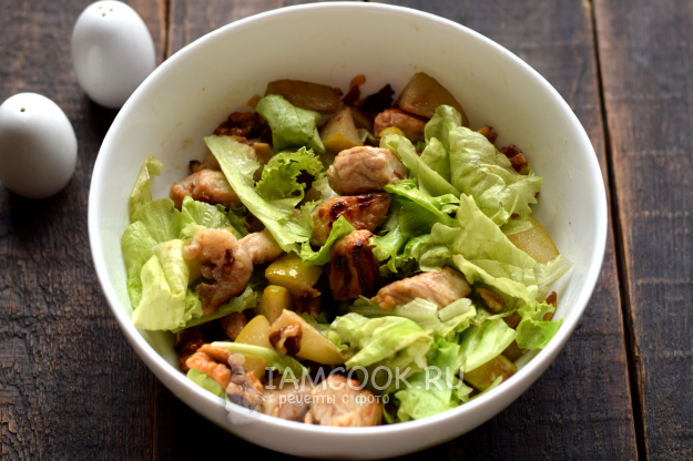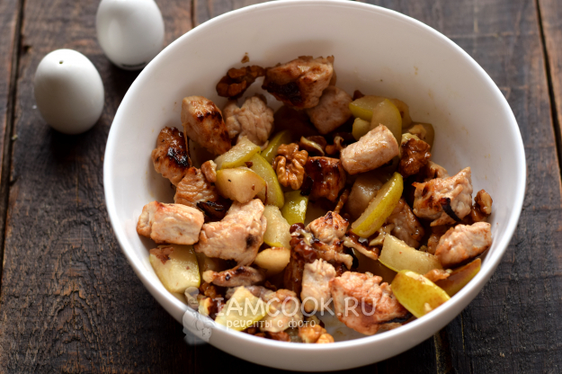 Жареную индейку соедините в одной емкости с карамелизированной грушей и орехами, перемешайте.