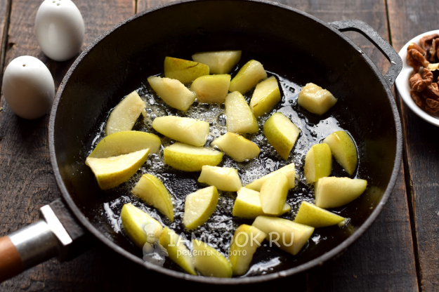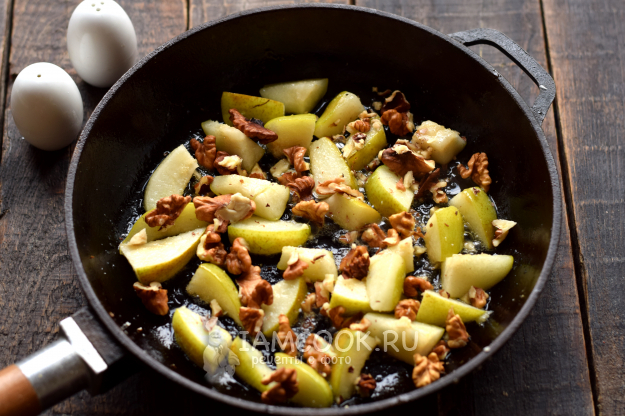 Карамелизируйте грушу 5 минут, в процессе добавьте орехи, чтобы они напитались сиропом.