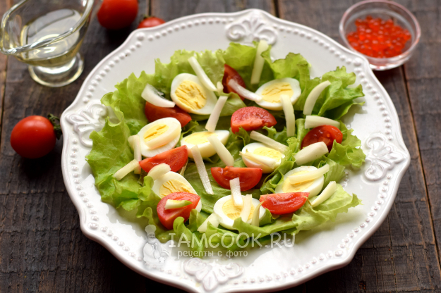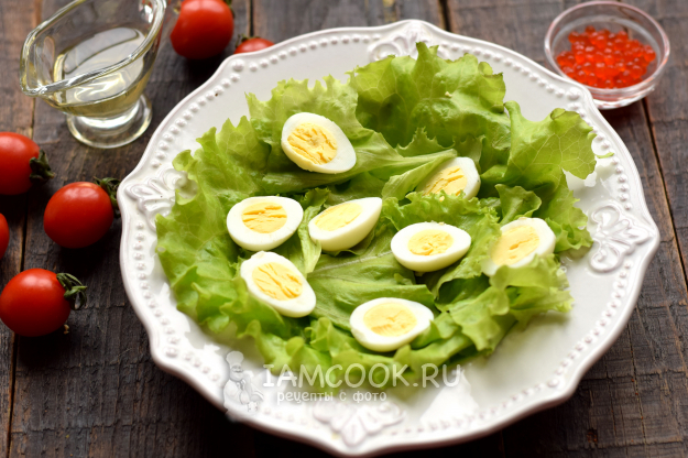 Перепелиные яйца отварите «вкрутую». Время варки – 4-5 минут после начала кипения воды. Яйца очистите, разрежьте на две части, выложите на листья.