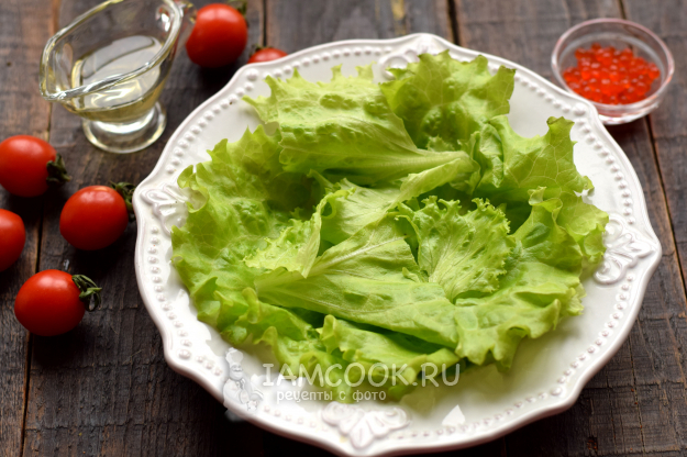 Листья салата ополосните, высушите на полотенце, порвите руками на крупные куски, выложите на тарелку.