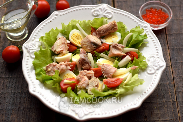 Консервированную горбушу достаньте из масла, разделите на крупные куски, выложите на салат.