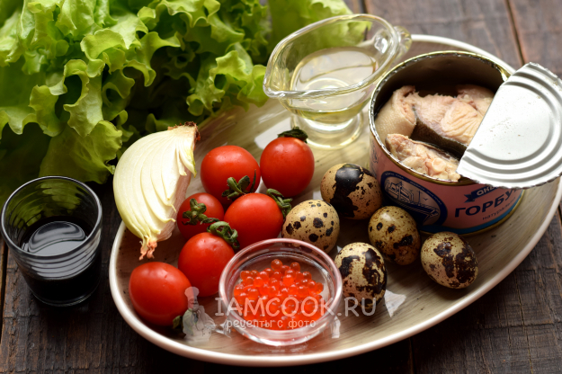 Подготовьте все компоненты для салата с икрой и консервированной горбушей.